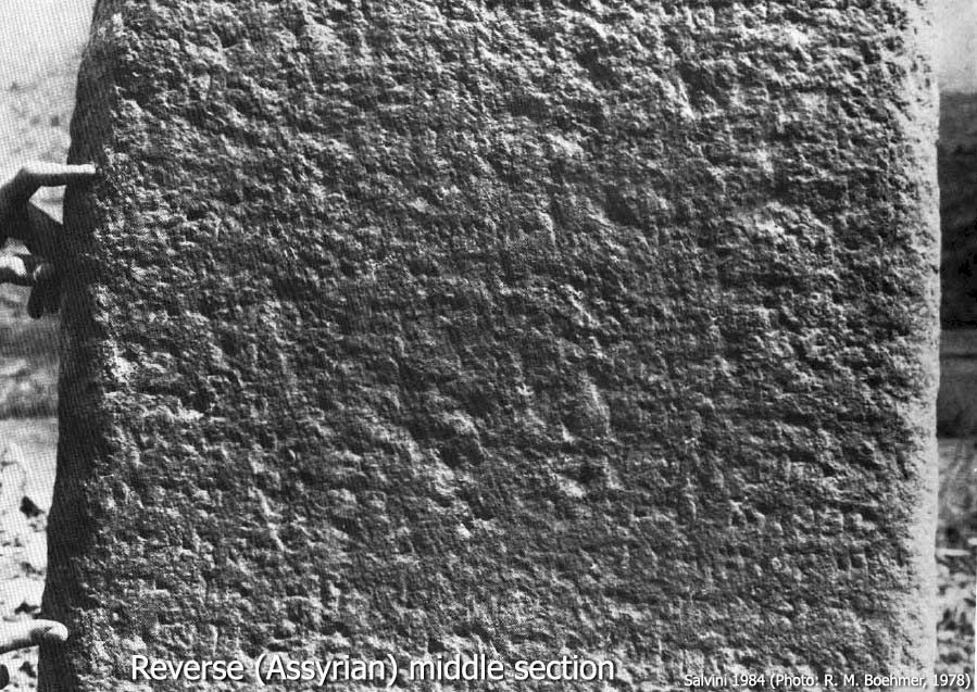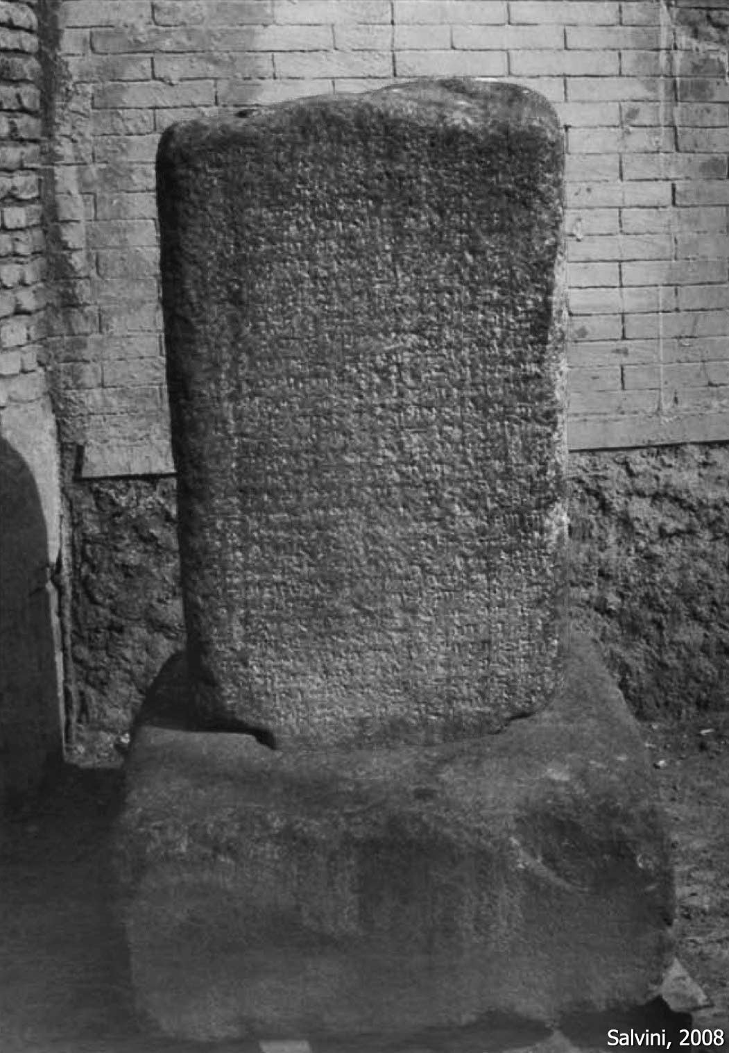 The bottom section of a four-sided stele fragment with a Urartian-Assyrian bilingual inscription was discovered in the early 19th century in situ, standing in a base about 1.5 km from the village of Topzawa. The stele remained there until recent years, when it was transported along with its base to the Erbil Museum in northern Iraq. Locally, the stele was known as Kel-i-gaur (“Infidel’s Pillar”). It stood about 25 km west of the Kelishin stele of Išpuini and Minua, which is about a century older. It was first copied and transcribed by Belck and C. F. Lehmann-Haupt in 1899. The text is a near duplicate of the two other steles of Rusa I: Movana (A 10-3) and Mergeh Karvan (A 10-4). The present fragment is 116 cm high (including a 35 cm tenon), 72 cm wide, and 33 cm deep. Since the Assyrian version has the same line arrangement as the 2.73 m-tall Movana stele (which is missing only the tenon), the original height of this stele must have been close to 3 m.