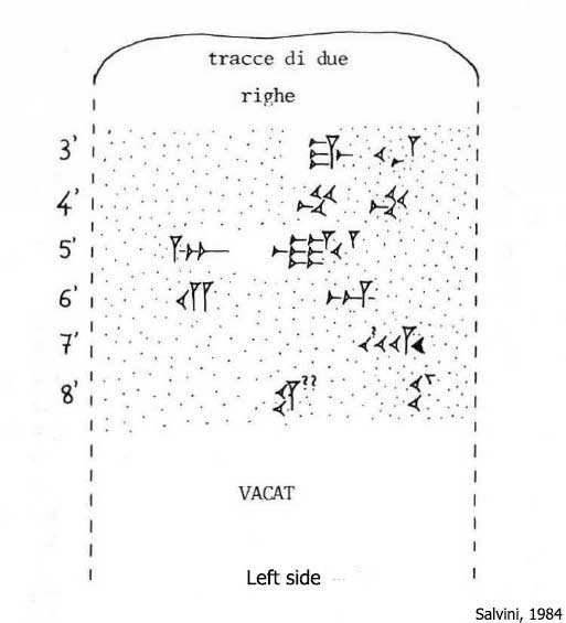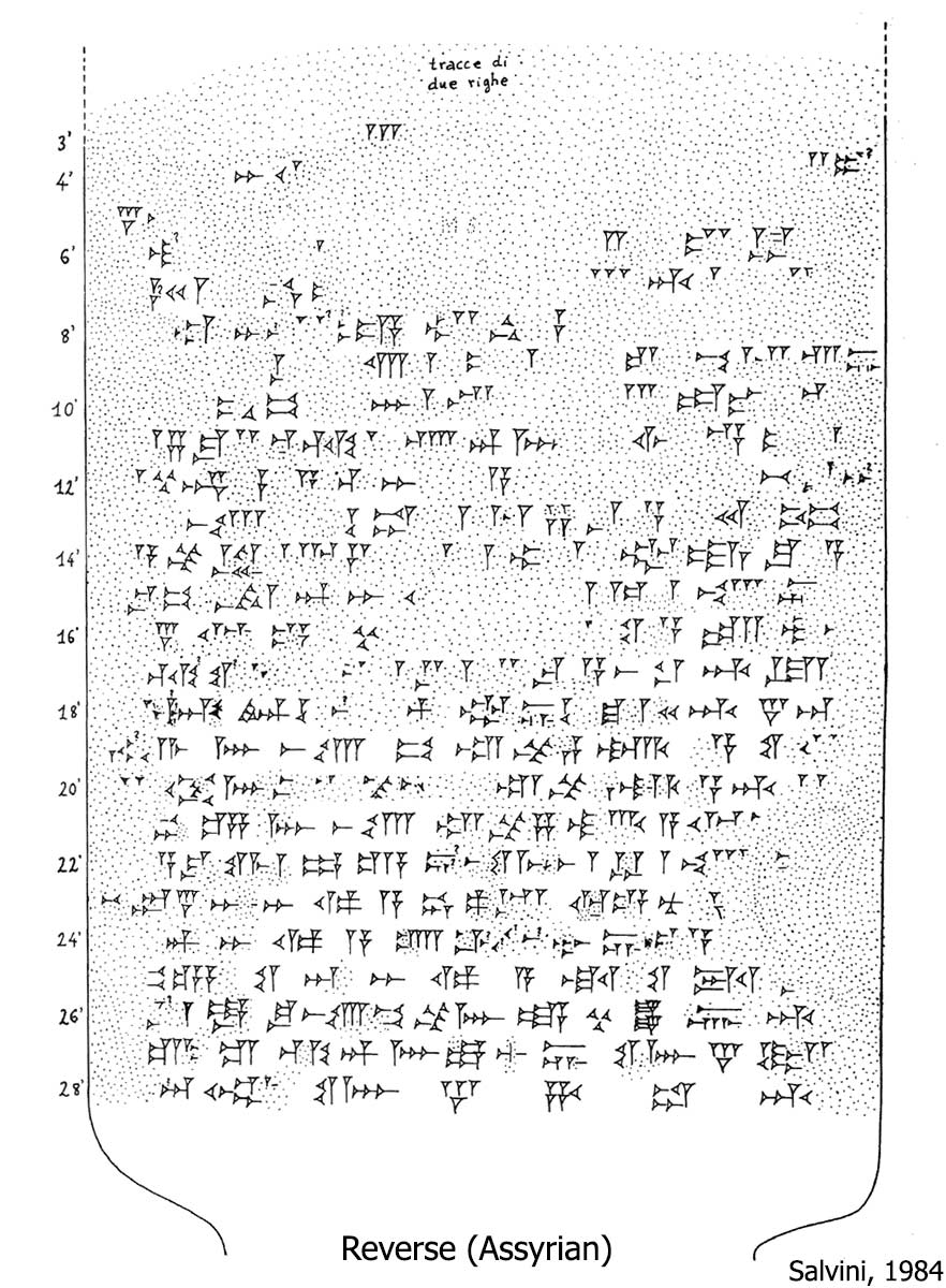 (rev. 3ʹ) [ . . the god] Hald[i …] (5ʹ) [ . ] that [ . . . . . . . . . . . . . . . . . . .] (6ʹ) [ . . . . ] the protector of consecration (7ʹ) [ . ] the kings my forefathers (and) predecessors who [ . .] (8ʹ) had not car[ried] these [gifts( ?)] to the city Muṣaṣir (9ʹ) I carried in (only) one campaign, (10ʹ) [more than(?)] all the kings I carried them to the city Muṣaṣir. (11ʹ) Urzana cl[osed] the gate of the house of the gods (12ʹ) [and?] he fled towards the land of Aššur. The god Haldi, the Lord, reo[pened] its shutters (13ʹ) [ . . ] there, inside (the temple) I fulfilled (my) rites. Against Urzana I [ . . ], (14ʹ) Urzana lined up [his troops] in battle against di me. (15ʹ) By the command of the god Haldi I, Rusa, (16ʹ) went to Mount Andarutu (17ʹ) and I imposee a defeat; I captured Urzana with my hand (18ʹ) [and I subjugated him]. I put him then in his (former) position for (the exercise of) regality. (19ʹ) [14 or 15] days I stayed in the city Muṣaṣir (20ʹ) all the scarifical animals . . I sacrificed for the city Muṣaṣir. (21ʹ) For the inabitants of the city Muṣaṣir . . [ . . ] (22ʹ) [ . . ] everyday I entered for the feast. I am Rusa, (23ʹ) the servant of the god Haldi, the true shepherd of peoples, (24ʹ) (I am) the one who approached tha house of the god Haldi, (I am) the one who fears not in the fight. Haldi gave me might and strenght [and joy]. In my years I enlar[ged] the land of Urarṭu [and] humiliated the enemy land. The gods gave me days of joy, [many] favourable days of joy.”